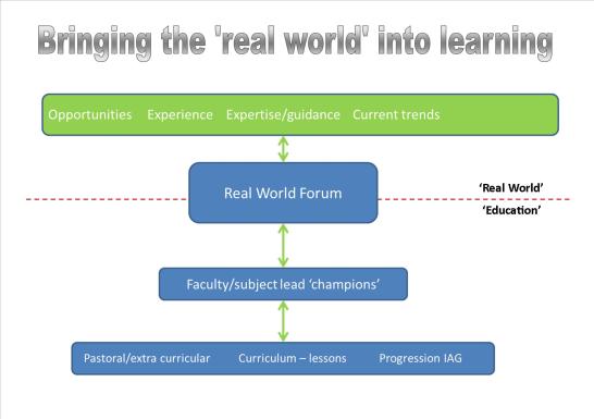 Aside from generall practice in most Schools such as field trips and educational visits, guest speakers etc I wanted to explore the layer beneath this. The everyday ‘normal’ good practice, one which constantly emphasises the vision and importance of learning in a real world context. This could be as simple or as complex as the teacher wants to make it, for example, it could be something as simple as crafting a learning objective by setting it in a real world or cross Curricular context; “Be able to explain how X can link to real life careers/professions” or “consider the skills needed for X and look at how they can be used in other subject areas”.