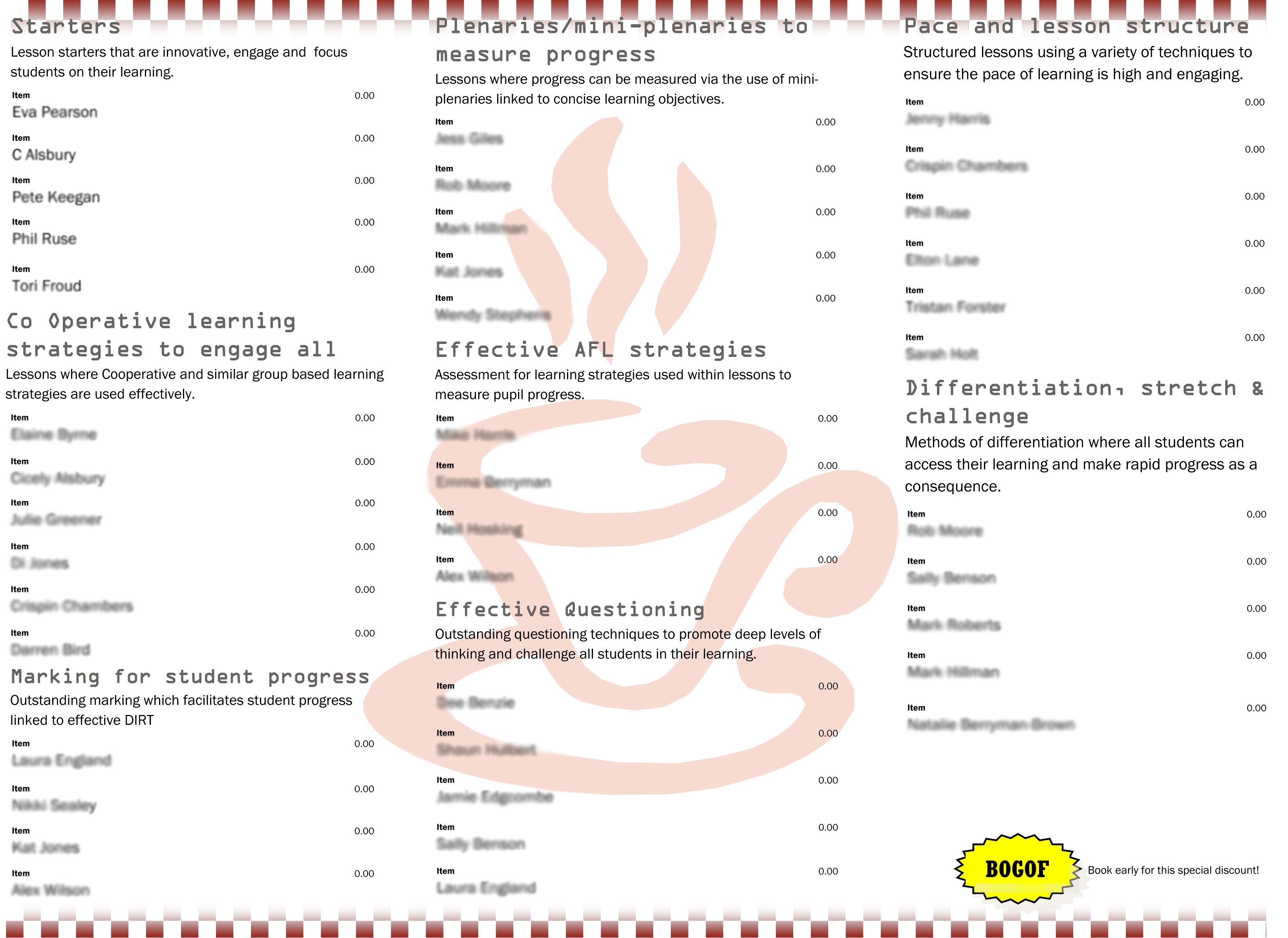 So what does it look like? It is literally like a take-away menu and I think that staff thought I was bonkers when I first introduced this over twelve months ago.  There are eight categories, identified as key elements of outstanding teaching and learning, focusing on different aspects these are: