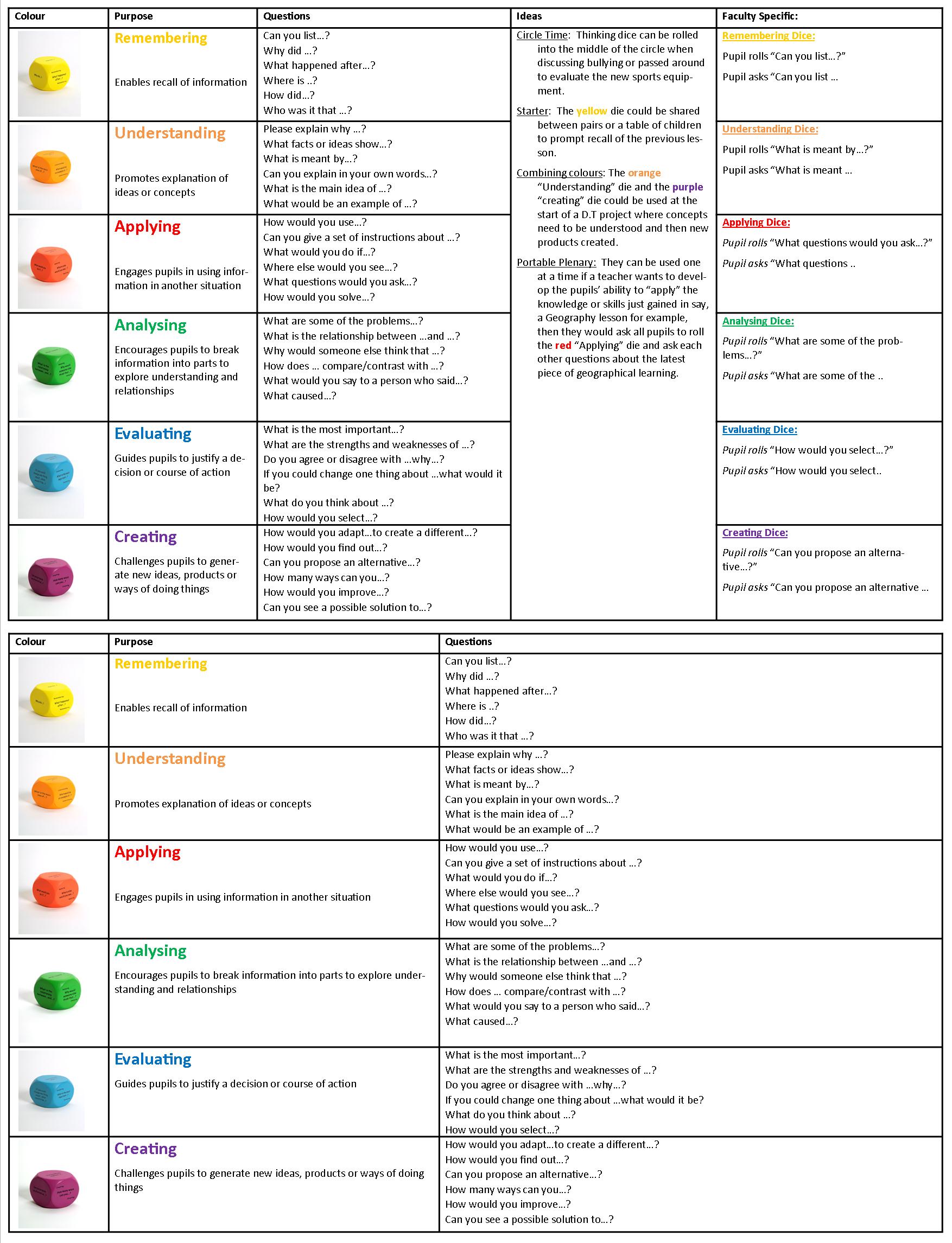 Expanding upon this further, the strategy is now linked explicitly to think dice to help promote students’ active engagement in their learning. This adds a fun dimension whilst enabling students to lead effective questioning of their peers. Think DiceThis can be and has been applied to all subjects from Key Stage 3 through to Key Stage 5.  I’m not advocating that this is and should be the only pedagogical strategy in your ‘toolbox’ but it has developed into one highly effective way to engage students in their learning, whilst stimulating deep thinking from effective questioning. Since I posted these pictures on twitter, I’ve had a lot of requests for the resource and questions regarding the thinking dice. Below is the word document that supports this and is the template for the printed key ring, simply click on the link below it to download. The dice were purchased from thinkingdice.com