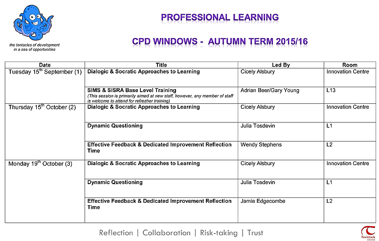received our Professional Learning brochure, in it the wealth of opportunities for all are outlined. You can download a .doc version here: The Professional Learning booklet I love a good metaphor and I felt the Octopus provided just that; always growing, with suckers that can hold onto key knowledge and the fact that they are among the most extraordinary creatures in the ocean. They can blend into the background, morph into the shape of other beasts, and even regrow limbs lopped off by predators (I let you decide who they might be!)