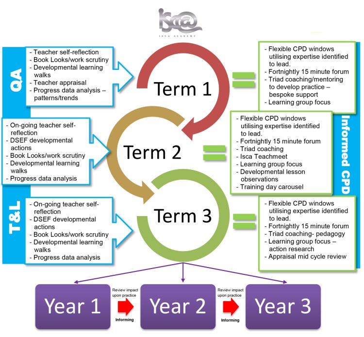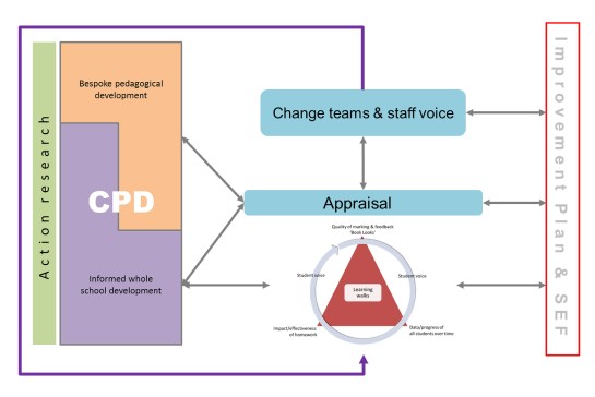 Teacher feedback and other background information will inform all three strands of professional development. Use micro and macro triangulation of teaching and learning over time and look for patterns and trends at a whole school level and subject specific level. Also and crucially, ask teachers to reflect upon their own practice and contribute to the construction of your professional development strategy and model.
