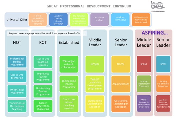 Written into our Academy improvement plan is; “Create a culture of professional ambition through high quality professional development and whole school leadership opportunities” and this is not tokenistic by any means. To compliment a comprehensive and informed offer, I believe it’s crucial to fully support the aspiration of all staff who express a desire to progress in their career. Here’s our continuum of professional development which not only outlines the wealth of opportunities, but also has a clear focus on aspiring leadership: