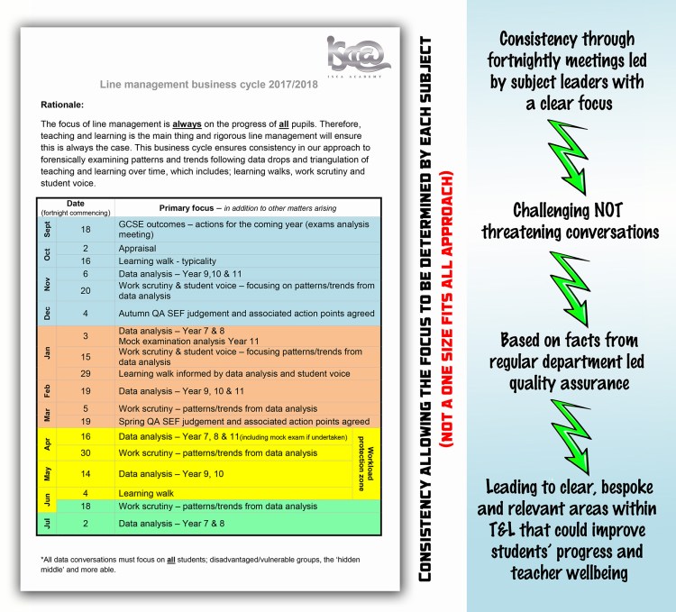The difficulty, or perhaps convenience for some, is how to bring about consistency across a school and at the same time allow teachers and department teams to identify and work on their own specific areas for improvement. I would like to offer one approach, one that works for us in our school and has empowered leadership at all levels. An overarching framework is provided with a fortnightly focus to ensure a consistent approach is in place, however, the focus within this is driven by the department team, informed by their own approach to quality assurance and the sharing of practice with colleagues.