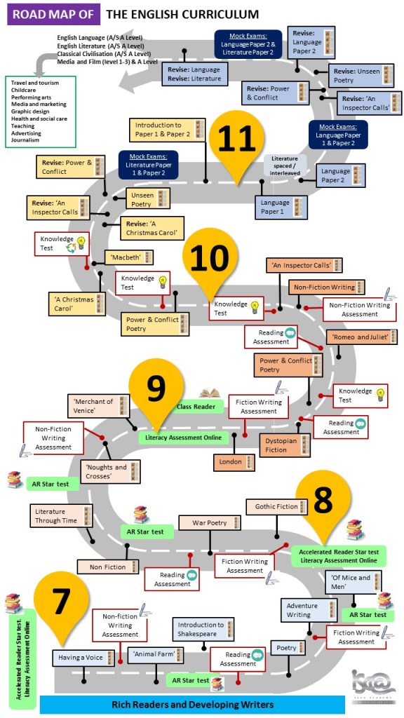 A sequenced curriculum is simply an expectation, and why shouldn’t it be? This must be a fully justified knowledge rich sequence of interleaving that builds upon prior knowledge and deepens students understanding and allows them to apply it in different contexts. A curriculum roadmap is a fantastic way to show students, staff, parents and carers the justified sequence of learning over a five year journey. Here is an example from our English department, led by the fantastic Caroline Sherwood (look her up on twitter @Caroline_Alice_)